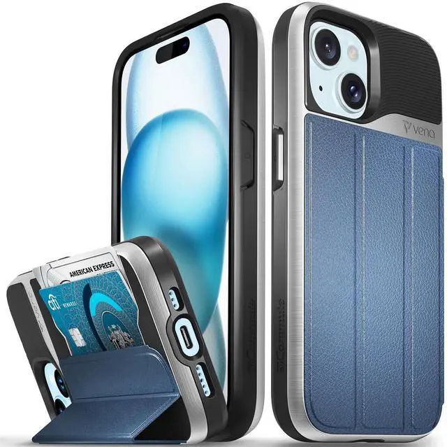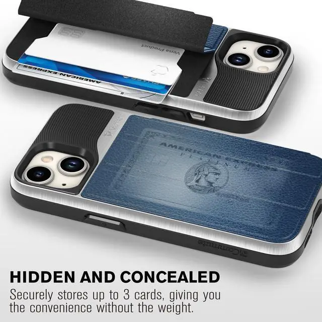 [PATENTED WALLET CASE COMPATIBLE WITH iPhone 15 ( 6.1" )] vCommute combines functionality and protection. The hidden card slot securely stores IDs, credit or debit cards, or even transit cards; plus it does not interfere with Apple Pay. Compatible with iPhone 15 ( 6.1" ). ^^ [MULTI-ANGLE MAGNETIC LOCK STAND] The foldable leather flap on the back of the case doubles as a kickstand so you can watch videos at desired angle and comfort. ^^ [MILITARY GRADE DROP PROTECTION WITH CORNERGUARD (TM) TECHNOLOGY] Dual-layer polycarbonate and TPU with CornerGuard (TM) exceeds military drop-test standard (MIL-STD 810G- 516.6 )