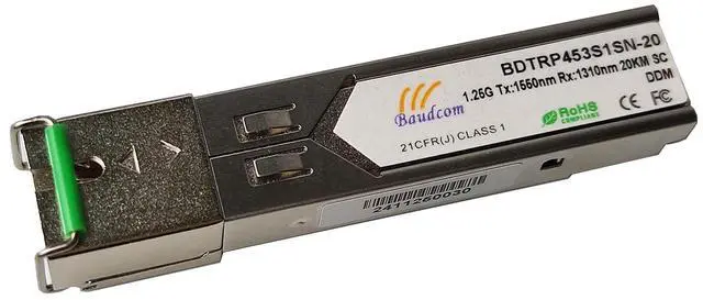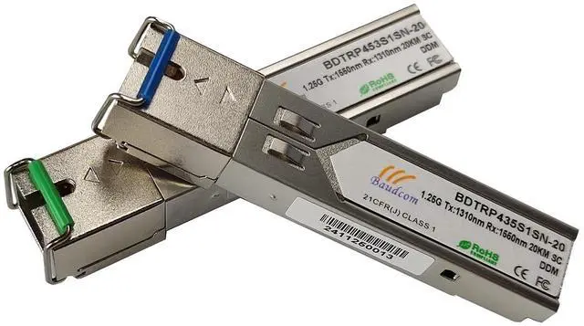 Wide CompatibilitySuitable for high-speed data transmission of big data in cloud computing, data centers, servers, high-speed network cards, big data storage, RAID disk arrays, high-speed networks, VR, unmanned driving and other equipment ^^ Connector Simplex SC; with DDMDigital Diagnostic Monitoring ^^ ParametersSingle power supply 3.3V /Class 1 laser product complies with EN 60825-1/1310nm FP laser and 1550nm PIN photo detector, 1310nm/1550nm, 1550nm/1310nm ^^ Durable Metal CasingEnsures strength and reliability for a long time, maintaining a stable connection in a wide range of environments. ^^ Hot PluggablePlug in or remove your SFP module without needing to shutdown your network.