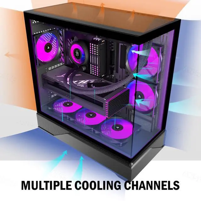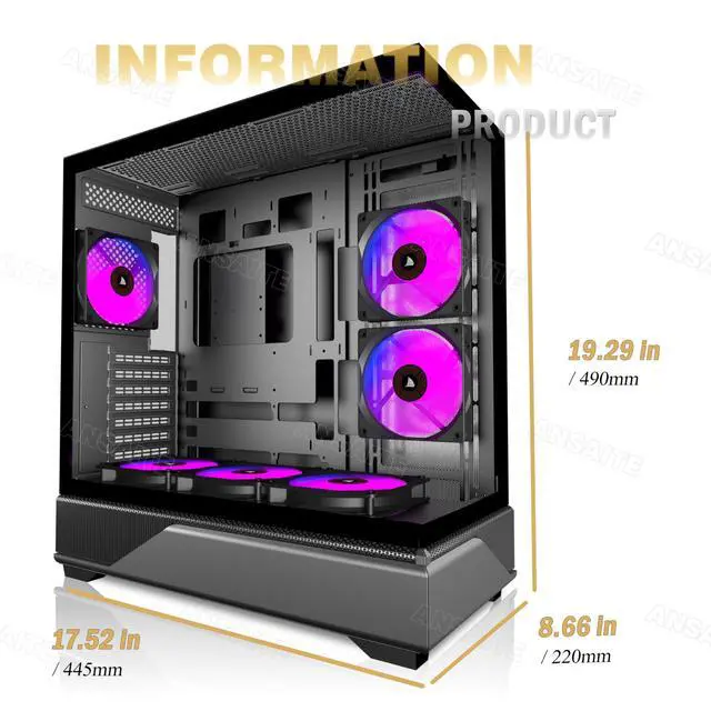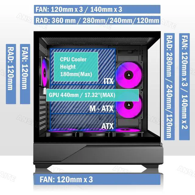 [Cooling ARGB PC Case from ANSAITE G8 ]Reason---G8 upgraded exclusive precision-engineered mesh panel design, and computer case comes pre-installed with 6 high-quality PWM ARGB fans (supports up to 10 *120mm case fans). G8 stands out with its stunning design, equipped with a 270 panoramic tempered glass side panel, providing stunning visual effects and strong airflow. G8 offers an ultimate comfortable experience in office and gaming scenarios, making it the most cost-effective "Black Knight" on the market! ^^ [Pre-installed 6 PWM ARGB Fans] G8 Rear panel pre-installed with 1120mm forward-blade fans, bottom pre-installed with 3120mm reverse-blade fans (F-A12 ARGB PWM), side panel pre-installed with 2120mm reverse fans (reverse-blade design combines aesthetics with intake cooling efficiency).
