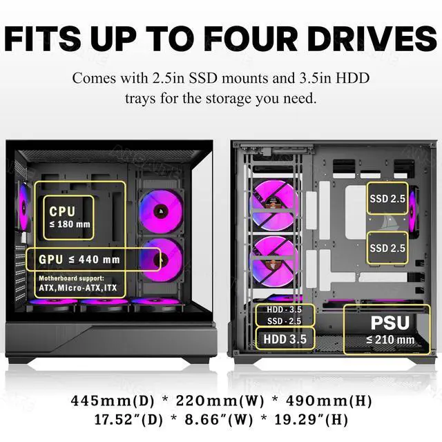 Compatible with mainstream hardware: Supports graphics cards up to 440mm ( 17.32 inches), CPU coolers up to 180mm in height, 360mm radiators on top, and power supplies up to 200mm ( 7.87 inches) in length; Equipped with mechanical hard drive and solid-state drive brackets; features 7 expandable PCIe slots; accommodates up to 10x 120mm case fans and 2 sets of side-by-side radiators. ^^ [SYNC RGB]--ANSAITE G8 Tower Case Fans can be controlled by computer software. Enjoy high-performance cooling and easy lighting through asimple +5V ARGB motherboard header, no controller necessary.
