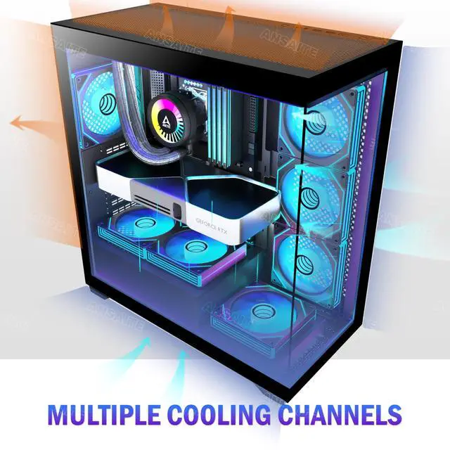 ANSAITE C9 upgraded PC case comes pre-installed with 7 high-quality prismatic ARGB fans that generate continuous gradient rainbow light bands with smooth, seamless color transitions. ARGB fans deliver powerful airflow while creating a unique visual spectacle. C9 Black PC Case features a 270 panoramic tempered glass side panel with excellent sound insulation. It not only showcases your high-end, stylish hardware components but also delivers an ultimate comfortable experience for office/gaming environments, making it the most cost-effective PC Case on the market! ^^ [Powerful Airflow Cooling]C9 PC Case utilizes a dual-channel airflow designhorizontal for CPU, vertical for GPUto deliver focused and efficient cooling.