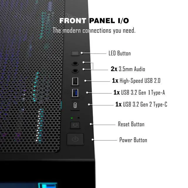 with motherboard synchronized lighting effects. ^^ [Upgrade High Speed I/O Panel]ANSAITE PC case maximizes external interfaces for enhanced functionality, featuring USB 3.2 Gen 2 TYPE-C high-speed ports to connect various new-standard devices. Enjoy faster transfer rates and reduced waiting time, along with superior power delivery performance. Fully equipped with Reset button and AUDIO interface to meet diverse daily office and gaming needs. ^^ [Back-Connect Ready]Ample cable management spaces combined with a back-connect design maintain a clean front panel while optimizing airflow. ^^ [Tower Case with Powerful Space Layout]The C9 gaming case features an ANSAITE-optimized internal structure with meticulously planned compartments.