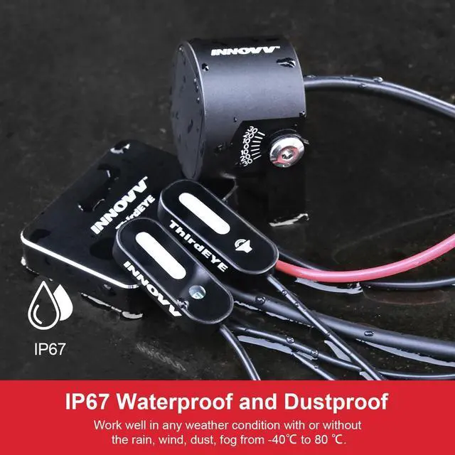 ^^ High PrecisionWith high 77~79Ghz sensor, the blind spot detection system is high performance in the range resolution, velocity measurement, and accuracy. Accurately calculation of the speed difference from cars to cars, warning the ride in time to avoid collision and lead a happy riding. ^^ Up to 64 targetsINNOVV Third Eye is able to detecting 64 targets simultaneously in a 50m maximum distance, never miss to pass any potentially dangerous warning to riders even in the complex but peace situation. ^^ Suitable for Most EnvironmentWith IP 67 waterproof and dustproof, INNOVV motorcycle blind spot system works well in any weather condition with or without the rain, wind, dust, fog from -40 to 80.