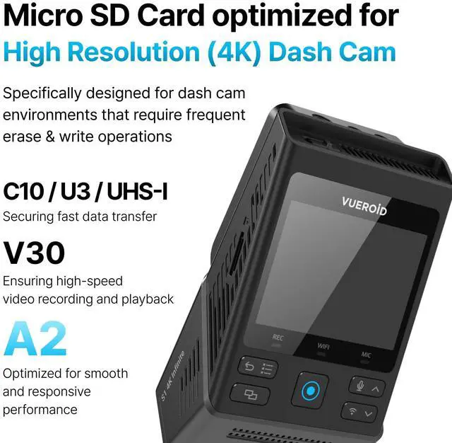 OPTIMIZED FOR DASH CAM: Vueroid Dashcam Pro microSD card is specifically engineered for dash cameras, body cameras, and security cameras that demand frequent erase and write operations. Designed with high endurance, it ensures stable storage with no data loss, and supports smooth recording without frame drops. ^^