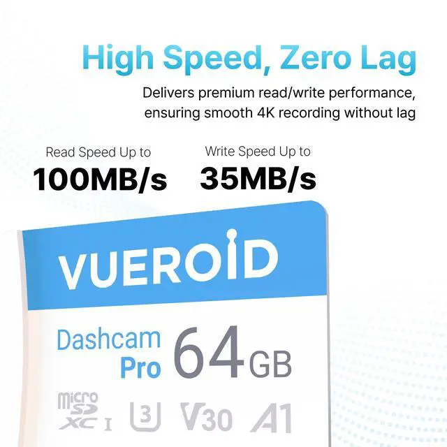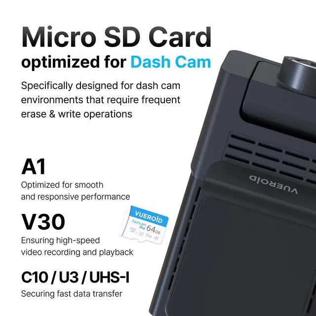 OPTIMIZED FOR DASH CAM: Vueroid Dashcam Pro microSD card is specifically engineered for dash cameras, body cameras, and security cameras that demand frequent erase and write operations. Designed with high endurance, it ensures stable storage with no data loss, and supports smooth recording without frame drops. ^^