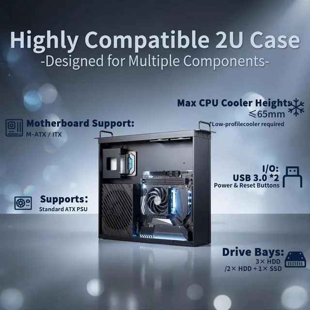 Broad Hardware CompatibilityThis versatile 2u server case, compatible with Mini ITX and Micro ATX motherboards (up to 9.6" x 9.6" ), standard ATX power supplies, GPU up to 11.4" in length, and low-profile CPU coolers (65mm height) for efficient, space-saving configurations. ^^ Flexible Storage ConfigurationOptimize your server storage with the versatile server rack case, designed to flexibly support 3 x 3.5 -inch HDDs for high capacity or 2 x 3.5 -inch HDDs plus 1 x 2.5 -inch SSD for balanced speed and space, all in a compact 2U chassis ideal for efficient rack mounting and seamless data management.
