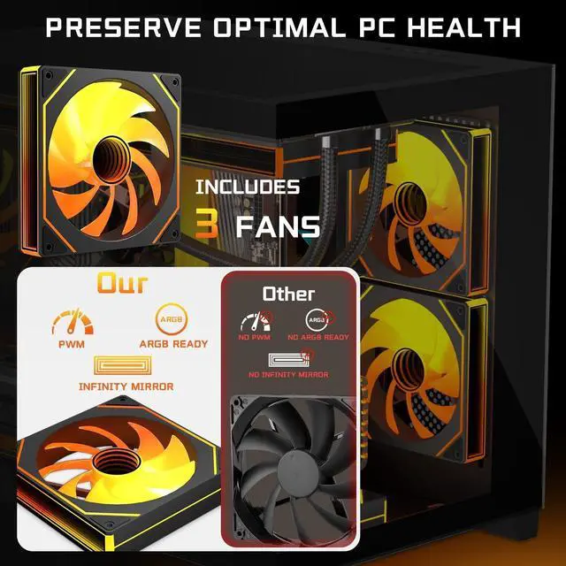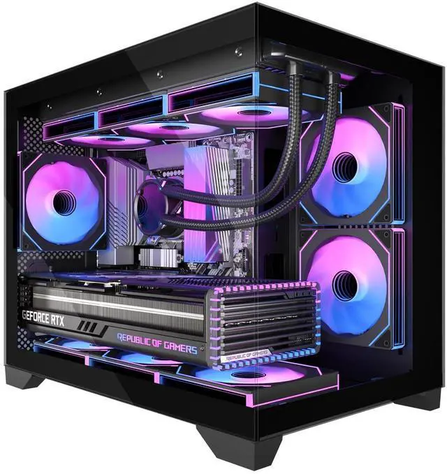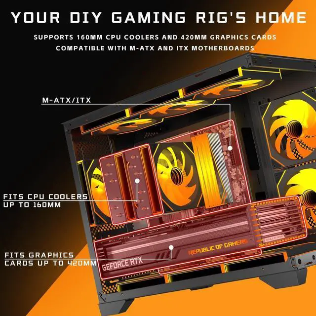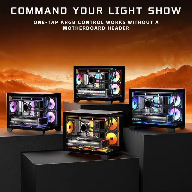 Includes 2x120mm ARGB Reverse FansElevate your build with this sleek matx case, which includes two pre-installed ARGB reverse fans. These fans not only create stunning seamless color transitions for a mesmerizing visual experience but also enhance airflow with their reverse blade design for optimal heat dissipation. Great for gamers and PC enthusiasts seeking both style and performance. ^^ PC Case Powerful Space LayoutEngineered for seamless builds, this high-performance micro atx case features a smartly partitioned interior that simplifies installation.