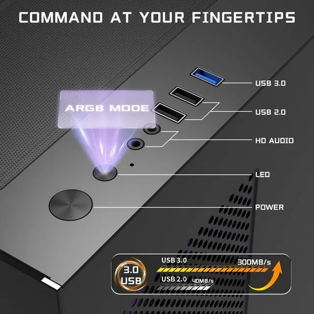 It boasts extensive hardware support: compatible with M-ATX/ITX motherboards, accommodates massive 420mm ( 16.5" ) graphics cards and 160mm tall CPU coolers, supports top-mounted 360mm liquid cooling, and offers dedicated mounting for 1x 2.5" SSD and 1x 3.5" HDD. ^^ 270 Panoramic Glass Design Showcase your high-end build with this micro atx pc case, featuring a 270 tempered glass design for an immersive view. Its compact rectangular shape saves desktop space while adding sleek elegance. The high-clarity tempered glass ensures natural light transmission, durability, and effective sound insulation, creating a comfortable environment for gaming or office use. ^^ I/O PanelThe pc gaming case is equipped with 1 x USB 3.0 port and 2 x USB 2.0 ports for high-speed connectivity, 2 x HD audio jacks for immersive sound, a power button, and a dedicated lighting control button to customize your rig's look. It's the versatile computer cases built to effortlessly handle both daily office tasks and immersive gaming sessions ^^ Advanced Cable ManagementThis gaming pc case features dedicated back-connect routing with spacious 8.5 cm and 3.5 cm management zones; it effortlessly tucks away all cables for a supremely clean build and unobstructed airflow to keep your system cool and visually stunning.
