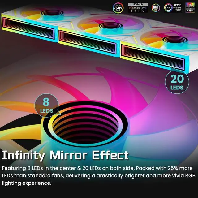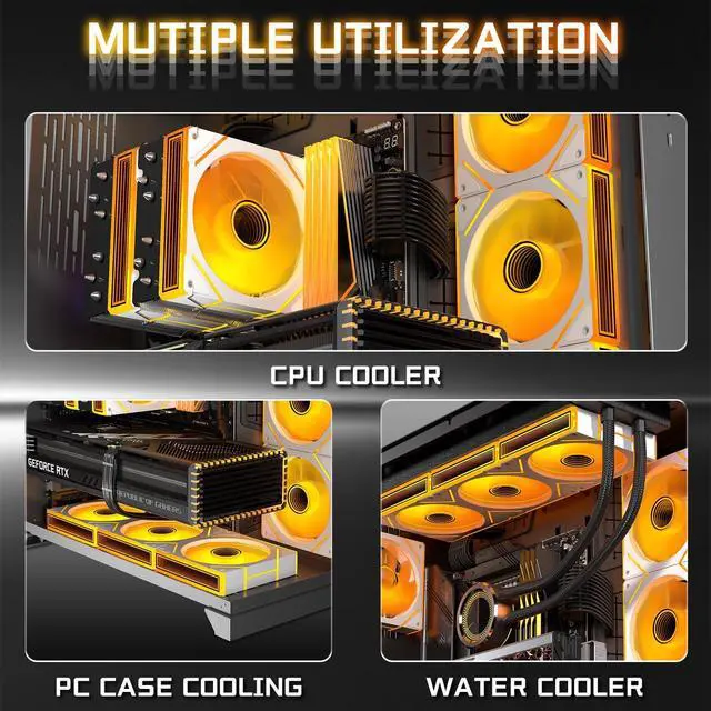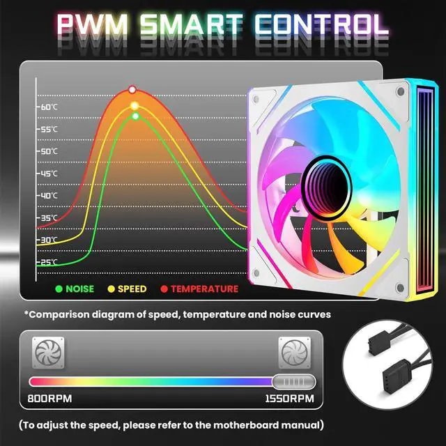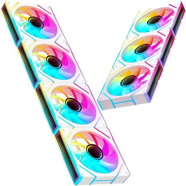 ^^ Increased LED Count: The number of LEDs has been increased by 25% to enhance both lifespan and lighting brightness. Its design ensures minimal wear and long-term high-performance cooling, making it ideal for professionals and gamers. This reduces the need for fan replacements and guarantees system stability and durability. ^^ Ultimate Cooling PerformanceOur case fans operate at 1550 RPM, making them an ideal choice for PC cooling. This speed was carefully chosen to balance performance with acoustic comfort. They efficiently expel heat, ensuring optimal temperatures even during intensive tasks. Their enhanced air pressure through heat sinks and complex pathways boosts cooling efficiency, delivering unmatched reliability for stability and high-performance users. ^^ PC fans are not only suitable for use as case fans but are also ideal for pairing with CPU coolers to create a synergistic cooling effect. They efficiently remove dry heat from the case and dissipate the intense heat generated by the CPU during operation, achieving maximum cooling performance. These fans are highly compatible with cases, AIO, and CPU coolers. ^^ 4 forward fan +3 reverse fans