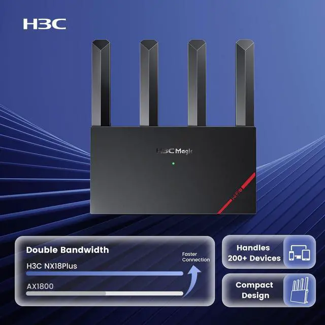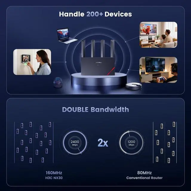 Coupled with ample 256MB of memory, it ensures rock-solid stability while connecting up to 200+ devices. Perfect for today's smart homes filled with phones, tablets, TVs, cameras, and IoT devices, all running smoothly at the same time. ^^ Compact, Space-Saving DesignThe computer router Featuring a sleek, vertical stand design with a remarkably slim profile of just 1.18 inches thick. Its stable, non-slip feet allow you to place it securely anywhereon a desktop, bookshelf, or media centerwithout taking up valuable space. The adjustable external antennas enable you to fine-tune the WiFi coverage direction for the best possible signal strength throughout your home.