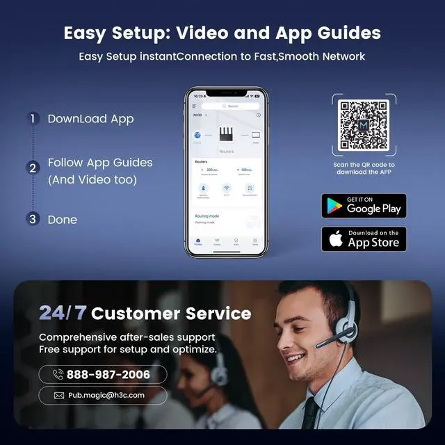 LIFETIME FREE security features: Guest WiFi isolation, IPv6 support, built-in VPN server, Intrusion Detection System (IDS), and the latest WPA3 encryption to keep your data private. ^^ Advanced Parental ControlsMonitor online activity in real-time, set WiFi schedules, filter harmful content, and manage bandwidth usage for any deviceall with no subscriptions required. ^^ Easy SetupGet online in minutes, not hours. Our intuitive mobile app guides you through the entire installation process with clear, step-by-step instructions and helpful video tutorials. Whether you're tech-savvy or a first-time user, you'll have your secure network up and running quickly, ready to connect all your devices. ^^ Reliable SupportWe stand behind our product. Should you have any questions, our dedicated customer support team is available via 24/7 email to provide timely assistance and ensure you have a smooth and satisfactory experience with your H3C router.