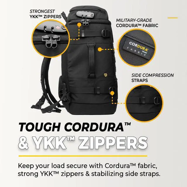 3 BUILT FOR HARD USE Cordura Fabric & YKK Zippers Constructed from military-grade Cordura and YKK zippers, this bag resists tears, abrasion, and rain. You can throw it in an overhead bin, drag it through mud, or haul it up a mountain its built to last years, not months.