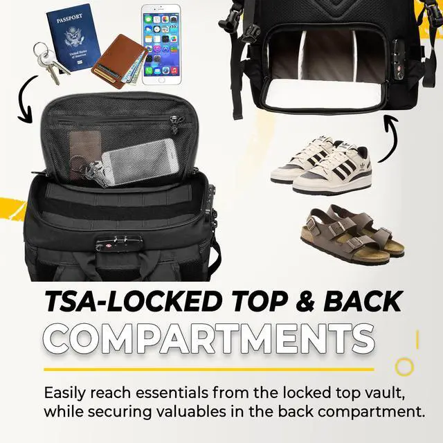 2 FULL LOCK SECURITY 3 TSA Locks Protect Every Compartment Three built-in TSA-approved locks secure your main, top, and hidden back compartments so every pocket is protected from theft and tampering. Keep your passport, laptop, and cash safe whether youre at the airport, hotel or in crowded public spaces.