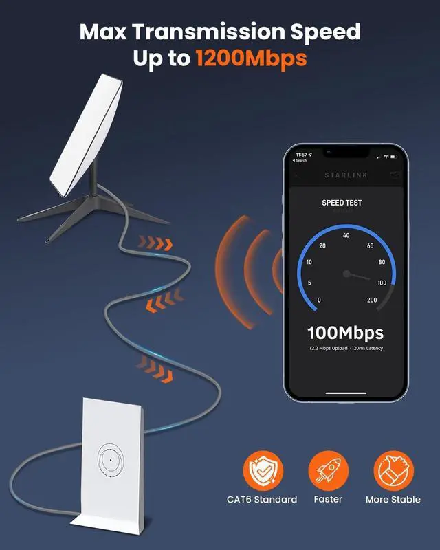 ^^ 1200Mbps High Speed: With network speeds up to 1200Mbps, it ensures smooth streaming and internet access without any lag or interruptions. It allows you to stream HD videos, music, surf the net, and play games at hyper speed. ^^ Durable & Weatherproof & UV Resistant: Shielded with a high-quality UV-resistant jacket, the Starlink Gen 2 cable is anti-aging and can withstand direct sunlight and extreme cold & humid & hot weather, yet still works efficiently. Suitable for both outdoor and indoor use.