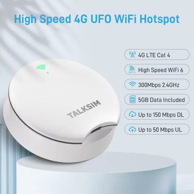 TALKSIM UFO Mobile Hotspot with 5GB Data, Portable Pocket WiFi 6 & 4G LTE Hotspot MiFi Device, Support AT&T, T-Mobile, Verizon ^^10 Connected Devices, USA Coverage, No Contract (White, 5GB)