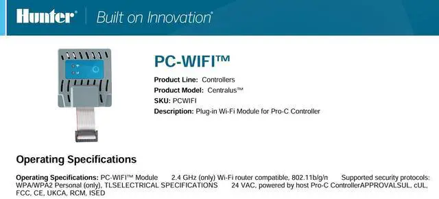 A Plug-In Wi-Fi Module for Pro-C Controllers (model P2C-400 only). Installs into P2C Faceplate (Part # 10032800SP, sold separately) as pictured.