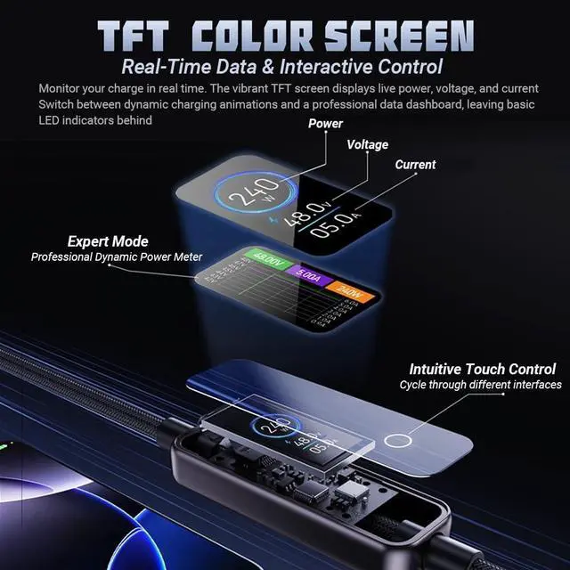 INTERACTIVE TOUCH-CONTROL DISPLAY: Why guess when you can know? Our industry-first, touch-sensitive screen puts you in control. Instantly switch between a real-time Digital Power Meter (W) for precise data, or a clear "Fast/Normal" Charge Mode status. While other cables leave you in the dark, our cable lets you see and command the power. ^^ 240W SMART VERSATILITY (PD 3.1
