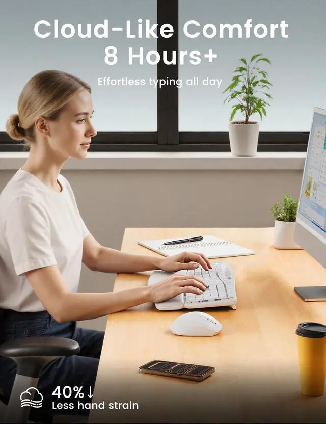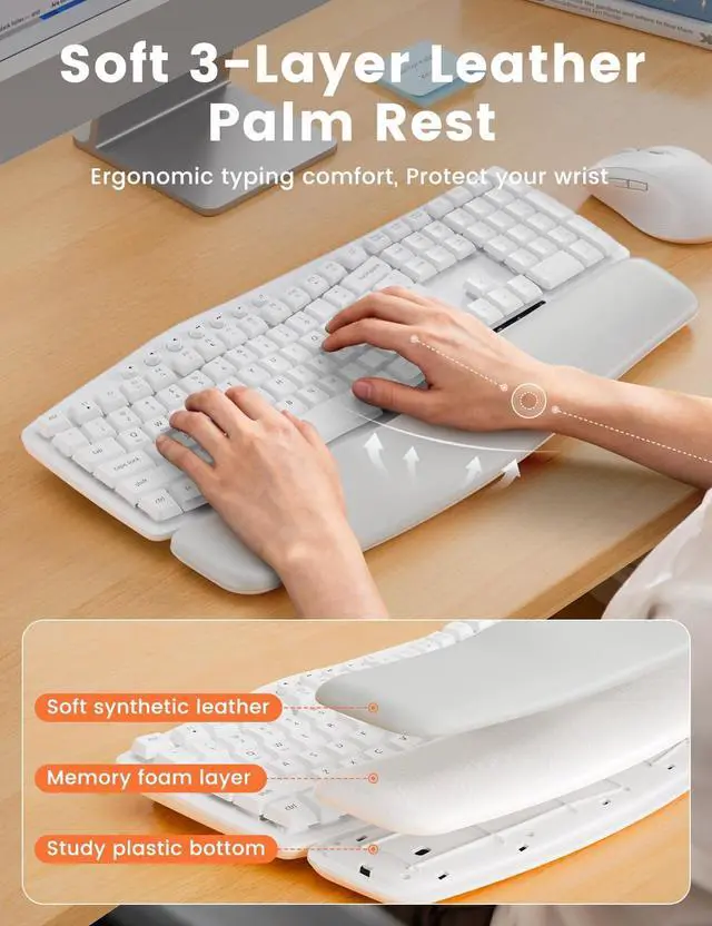 30dB Ultra-Quiet Typing, No More Clacking Keys - This ultra-silence wave keyboard lets you focus, flow, and think clearlywhether you're deep in spreadsheets or on back-to-back Zoom calls. It's a productivity dream for shared workspaces, home offices, or late-night sessions. ^^ Cloud-Like ComfortDesigned for Long Hours - Sink into our buttery-soft faux lambskin leather palm rest (waterproof & stain-resistant! ) paired with ergonomic wave keys that hug your fingertips. Reduce wrist strain by 40%* and type 8+ hours fatigue-free. ^^ Modern, Professional Design Featuring a matte finish, sculpted curves, and clean lines, plus a spill-resistant build that safeguards against accidents.