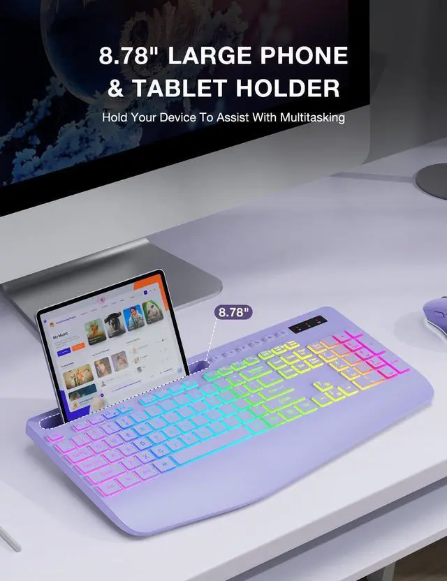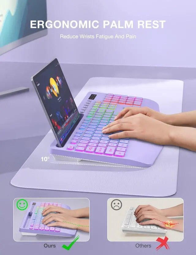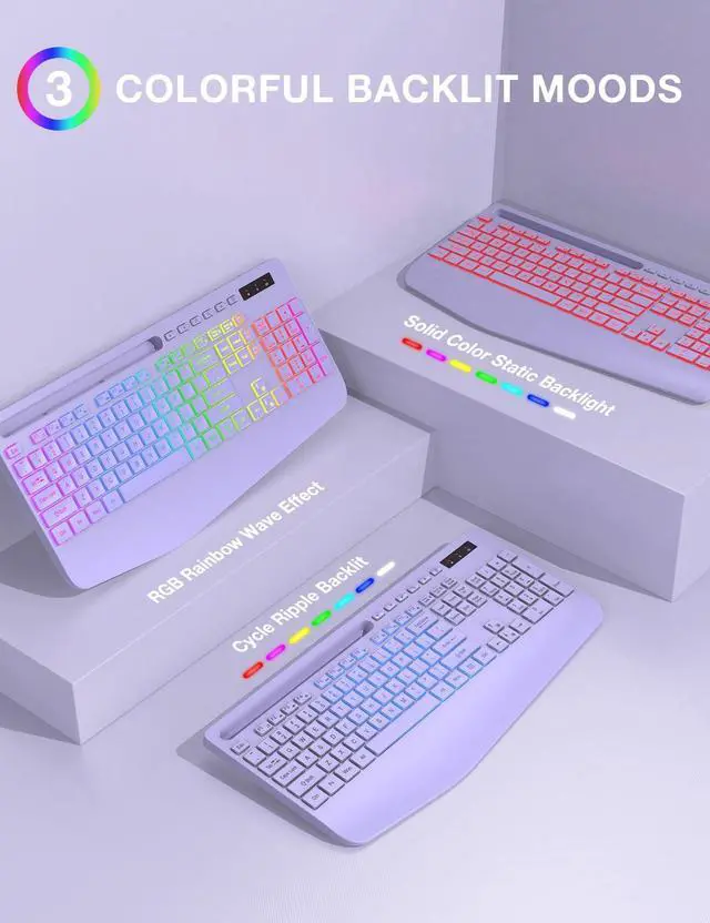 8 Colored & 9 Effects BacklitsThe computer keyboard has 8 backlight colors, 3 backlight modes and 3 brightness levels to choose from, which can help you type better at night and improve the atmosphere of your desktop with lighting effects. ^^ Ergonomic Wrist SupportOur ergonomic keyboard is equipped with a 2.8" widest edge wrist rest, which increases wrist support by 54%, reduces stress on hands and wrists. Perfect for office workers or gamers who need to use the keyboard for long periods of time. ^^ Rechargeable & Energy Saving Rechargeable gaming keyboard can be charged by supplied Type-C charging cable.