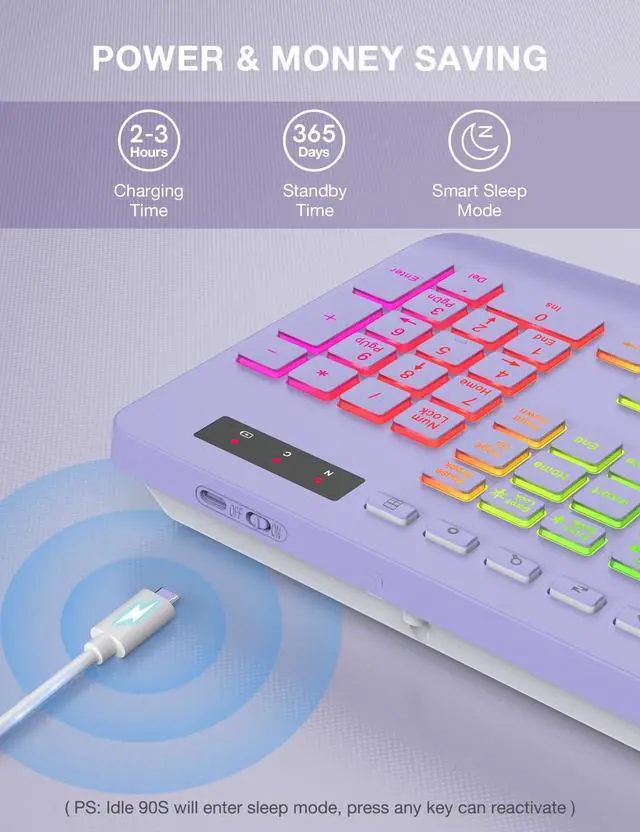 Built-in smart sleep mode, the backlit keyboard will sleep after 90 seconds of inactivity, which can help you better save power and can last up to 24 months on standby when fully charged. ^^ Less Noise, More FocusOur soft crater membrane keyboard ensures consistent transmission force for each keystroke, significantly reducing typing noise by 95%. Low profile keys provides a laptop-like efficient typing. ^^ Wide Compatibility 2.4G USB-A plug and play. Our keyboards wireless are compatible with Windows, Linux, Chrome and macOS.