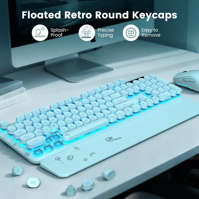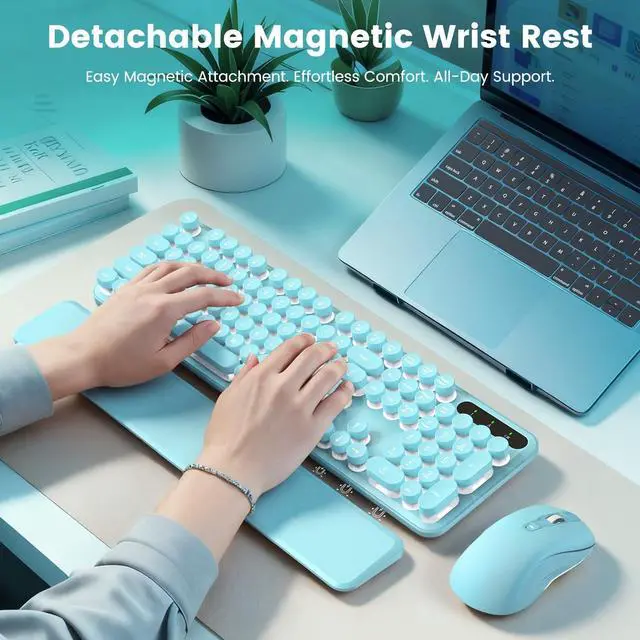 systems: Windows/Mac (press Fn+Q/W at the same time to switch)Two adjustable tilt legs can adjust the comfortable typing angle and position when typing. 2. Detachable palm rest with magnetic suction, more ergonomicThe detachable wrist rest can provide 54% more wrist support and reduce the pressure on muscles. It has 6 anti-slip pads on the bottom, which can be stable on smooth desktops. It is made of environmentally friendly materials, washable, easy to clean. 3. Beautiful computer mouse, more