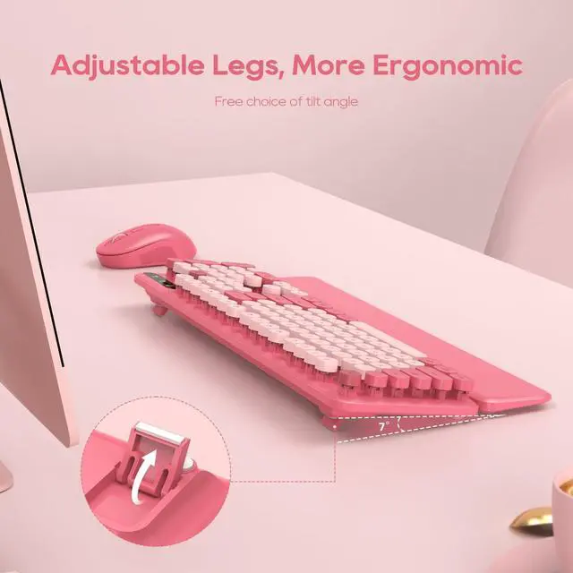 Magnetic Wrist Rest: The ergonomic wrist rest provides 54% more wrist support, reducing fatigue and pain caused by hanging wrists, making typing more comfortable. The hard palm rest with built-in magnets can be easily adsorbed to the keyboard, waterproof and easy to clean ^^ Floated Retro Round Keycaps & Splash-proof Design: The crisp key sound takes you back to the industrial era, and the retro circle keycaps facilitate finger positioning. The floating keys under your fingertips are comfortable and skin-friendly ^^ Adjustable Tilt Legs & Anti-Slip Pads: The keyboards foldable legs and 7 anti-slip pads on the bottom can provide an ergonomic angle and a stable typing position. The contour of the computer mouse fits comfortably in the palm of your hand, making it easier to use. ^^ Advanced Wireless Connection, No
