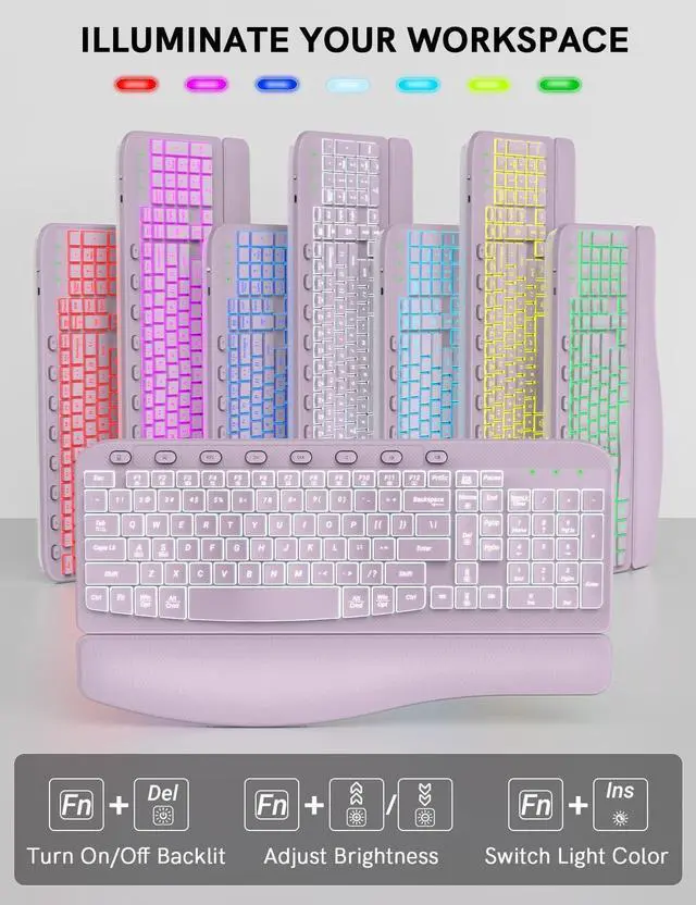 ILLUMINATE YOUR WORKSPACE: The wave ergonomic wireless keyboard features 7 switchable backlights, paired with an RGB mouse that automatically changes colors. Even in the dark, the illuminated keys make typing easy. Adjust the brightness or turn off the lights anytime to save power ^^
