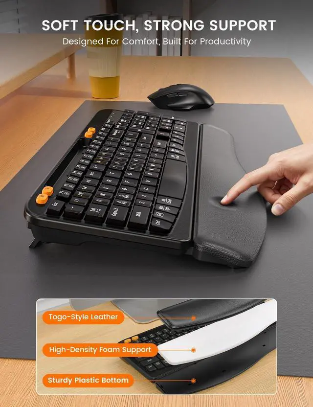 SOFT LEATHER WRIST REST: The wireless keyboard has a sponge-filled integrated leather wrist rest, which provides soft support. And the fitted design disperses pressure, relieves fatigue from long-term typing, and makes office more comfortable.