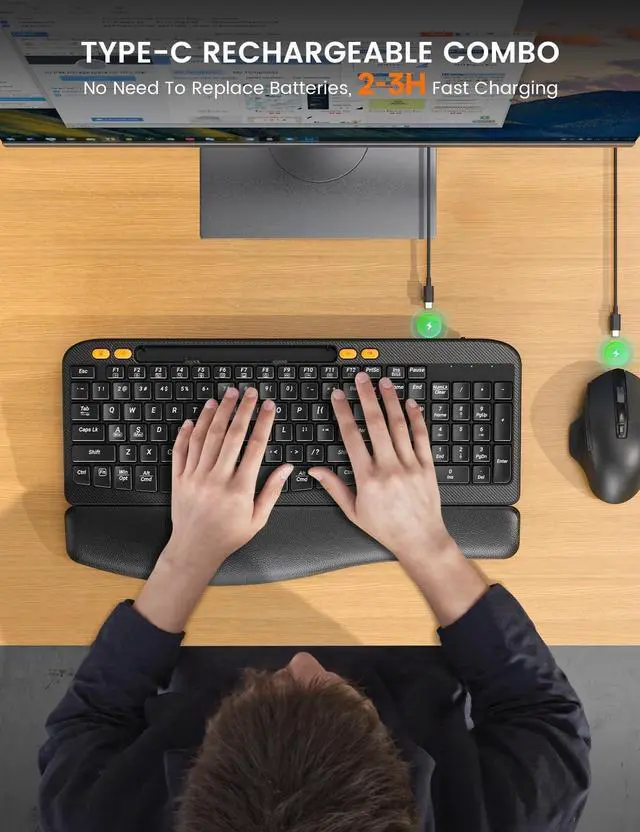 ERGONOMIC CURVED DESIGN: Using traditional keyboards for a long time may cause muscle fatigue. Our ergo keyboard adopts ergonomic arc design, which naturally fits the curve of the palm, reduces wrist pressure, helps maintain a neutral posture, and thus reduces the risk of repetitive strain injury. ^^
