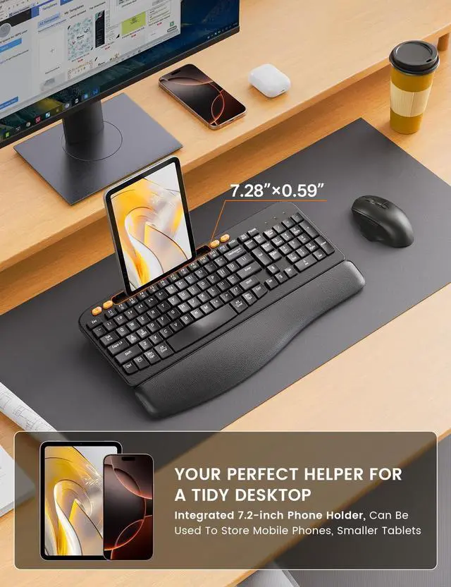 PHONE HOLDER: The full-size keyboard is designed with a 7.28 '' holder. This allows you to multitask on other devices while using our wireless keyboard and mouse combo and never miss anything important again.