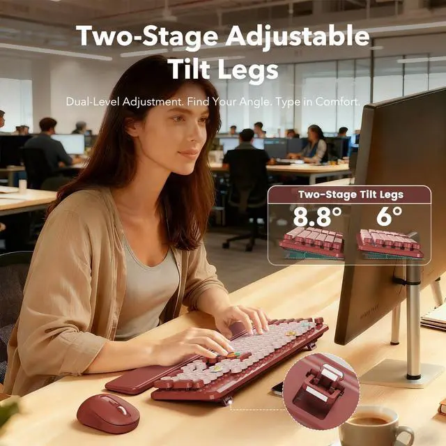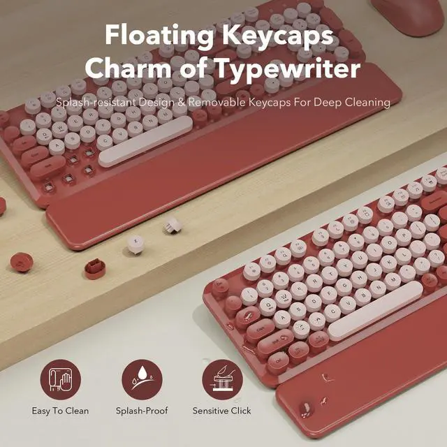 Retro Round Keycaps: Accidental coffee or water splashes? No problem. The splash-proof design wipes clean in seconds, while floated retro round keycaps are skin-friendly and comfortable to type on. Removable keycaps let you deep-clean dust and crumbs to keep your wine red desk setup tidy and fresh. ^^ Stable Typing Angle & Comfy