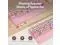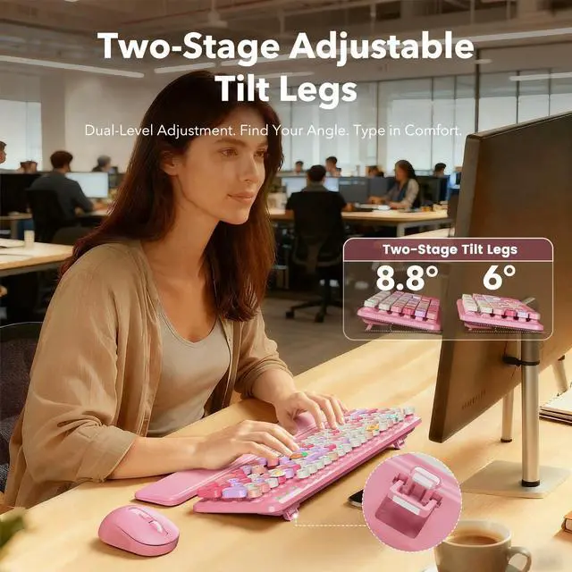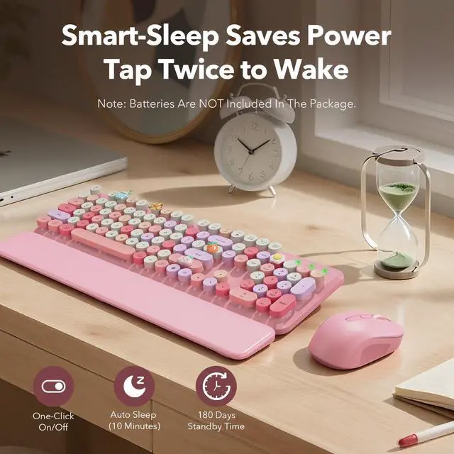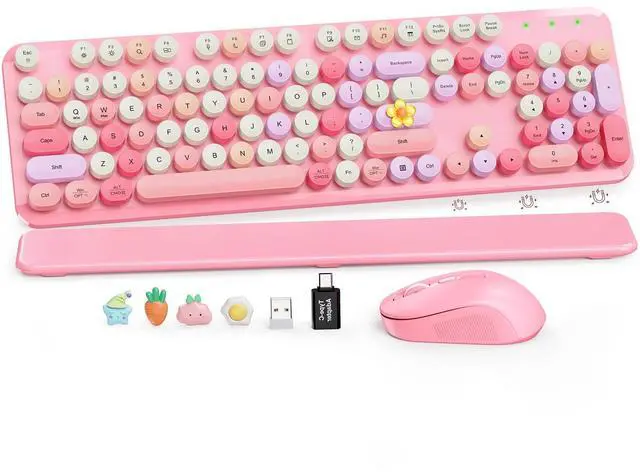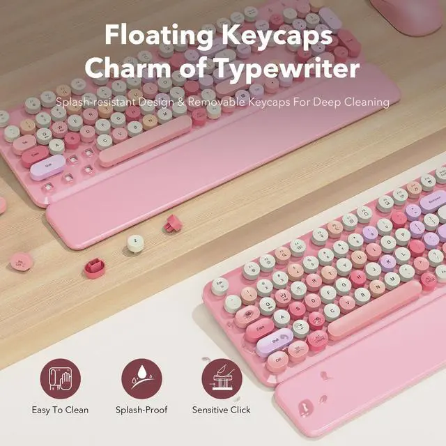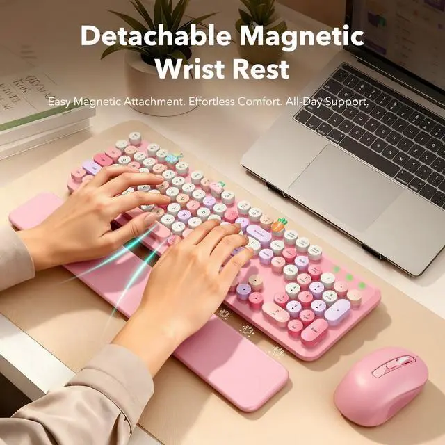 Mouse Combo Pink Multi-Color: A cute retro typewriter-style wireless keyboard and mouse set designed to brighten up your desk with pink base tones and multi-color round keycaps. The full-size 104-key layout with numpad keeps everyday work efficient, while the floating round keycaps feel satisfying to type on and can be removed for deeper cleaning anytime. A splash-resistant surface makes small spills easier to wipe away, and foldable tilt legs help you find a more comfortable typing angle for long work or study sessions. The detachable magnetic wrist rest snaps on in seconds to support your palms and help reduce wrist strain, with anti-slip pads to keep it stable and a wipe-clean finish for a neat setup. The ergonomic mouse offers smooth control with a comfortable contoured grip and 3 adjustable DPI levels (800/1000/1200) for daily browsing and tasks. Both the keyboard and mouse use a stable 2.4GH z USB receiver connection for plug-and-play setup (no Bluetooth), include independent power switches, run