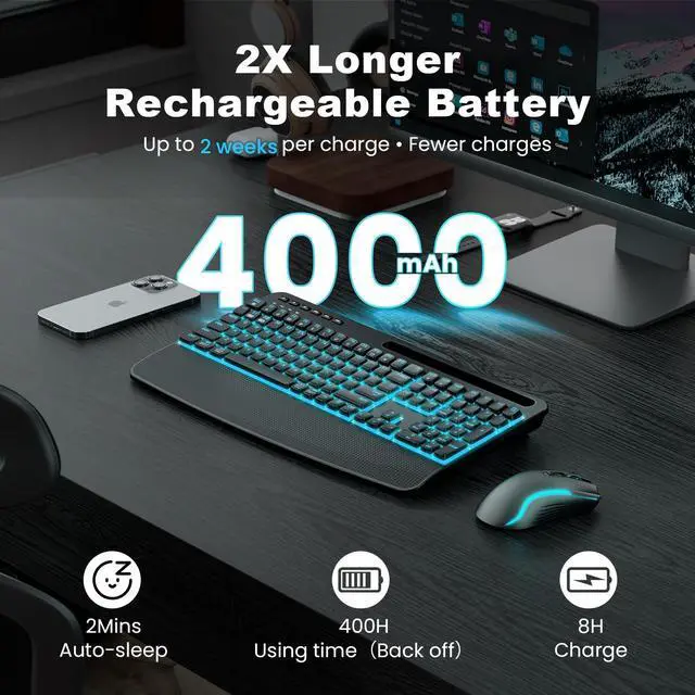 Rechargeable 4000mAh Ultra-Large Battery Lasts 2X longer than standard backlit keyboards (15002000mAh). With auto-sleep, one charge powers weeks of work or play.