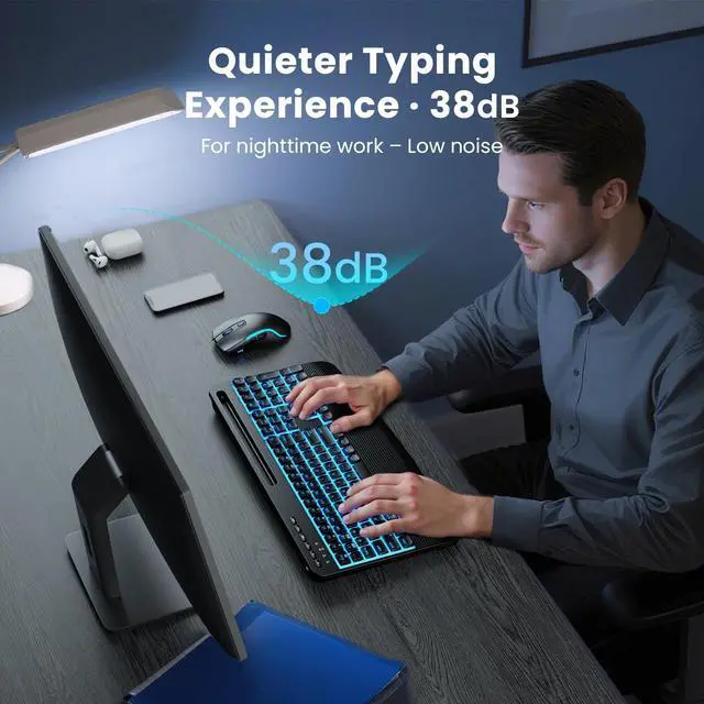 (Peace of mind: 30-day return + 1-year replacement. ) ^^ Customizable 7-Color Backlighting - Work confidently in any light. Choose from 7 colors and 3 brightness levels. Our dual-layer keycaps are "fade-proof, " ensuring letters never disappear. The mouse features auto-cycling RGB to add a professional glow to your desk. (Not fixed or selectable, with an option to turn lights off anytime) ^^ Ergonomic Design with Integrated Stand - Reduce wrist fatigue with the oversized palm rest and adjustable tilt angles (6/10). The sculpted mouse fits perfectly in your hand, while the built-in cradle securely holds your phone or iPad Mini for easy multitasking. ^^ Universal 2-in-1 Connectivity - Plug & Play via USB-A or USB-C. Enjoy a rock-solid, lag-free connection up to 33ft. Fully compatible with Windows, macOS, iPad, and Chrome OS. The receiver stores inside the mouse.