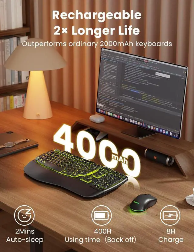 (Peace of mind: 30-day return + 1-year replacement. ) ^^ Ergonomics Designed Sit or standnew adjustable front/back stands support healthy wrist posture. Wave keys deliver smoother, more comfortable typing, so you can type for 8 hours without fatigue. Perfect for pros, home offices, and daily work ^^ Backlit Style Sleek, refined lines and backlighting bring both style and focus to your workspace. Choose soft tones (blue, cyan, white) for calm productivity or bold colors (red, green, purple, yellow) to match your moodone for every day of the week. ^^ RGB Mouse 700mAh battery, auto sleep mode, 6 buttons, and 3 DPI levels (800/1200/1600). Tired of mice with only cycling lights? This one lets you choose 6 fixed colors or 5 cycle modes. Plus, the keyboard has 9 shortcut keys to boost productivity. ^^ Universal Compatibility One 2.4GH z USB receiver (33ft) connects keyboard and mouse. USB-A & C combo works with 99% of devicesPC, laptops, tablets, desktops, Macs. plug and play.