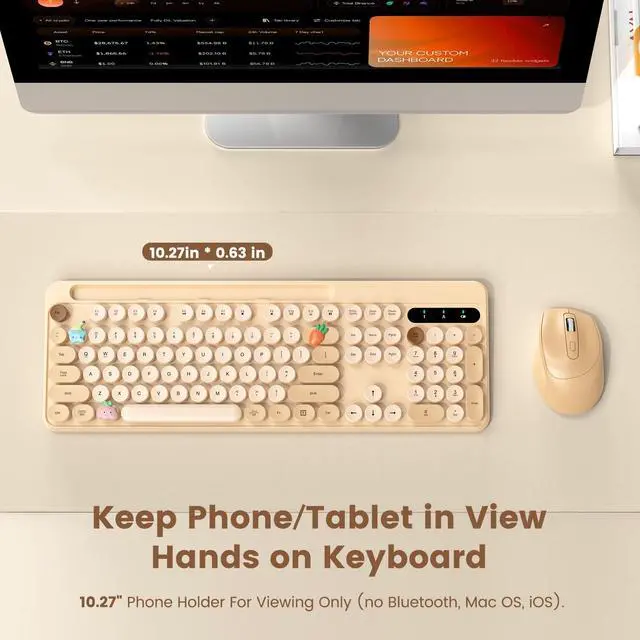 and washableNumber of keys: 104Two adjustable tilt legs can adjust the comfortable typing angle and position when typing. 2. Wireless keyboard with large phone holderThe phone holder can hold your phone/tablet for convenient viewing anytime.