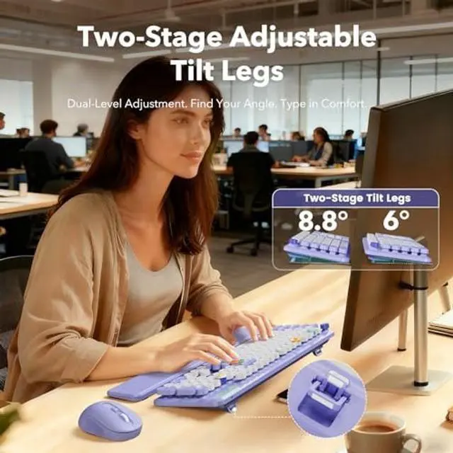 Style Keyboard: Decorate your workspace with this stunning purple typewriter-style keyboard. Its unique retro aesthetic and modern functionality create a joyful typing experience that showcases your personality and elevates your desk's style. ^^ Detachable Wrist Rest for