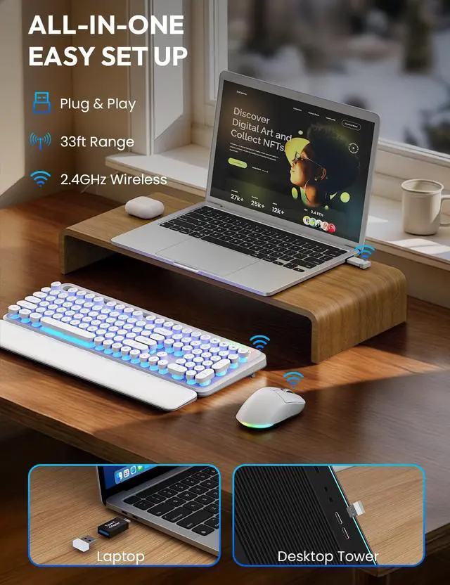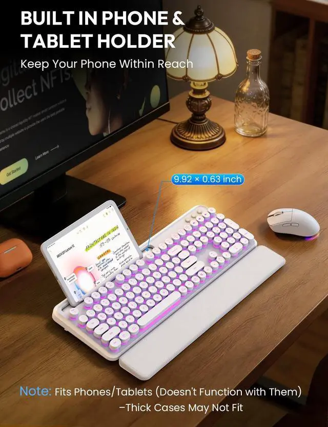 7-Color Backlit Wireless Keyboard Choose from 7 soft backlight colors to match your workspace. Light-up keys make night typing easier and add a clean, modern glow to your desk, along with an RGB mouse featuring 11 switchable lighting modes. ^^ Built-In Phone Holder Slot The integrated phone groove props your smartphone upright for quick viewing of messages, calls or videosgreat for multitasking, meetings and streaming while you work. ^^ Retro Style, Modern Design Round typewriter-style keycaps meet a sleek, spill-resistant body. This unique keyboard adds personality and a touch of elegance to your home, studio or office setup.