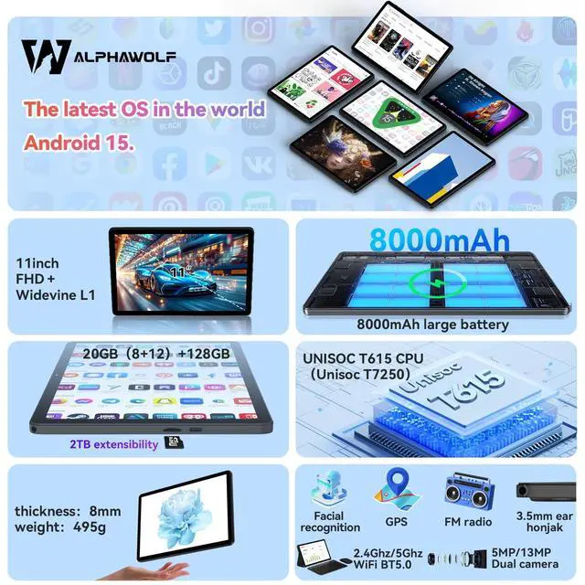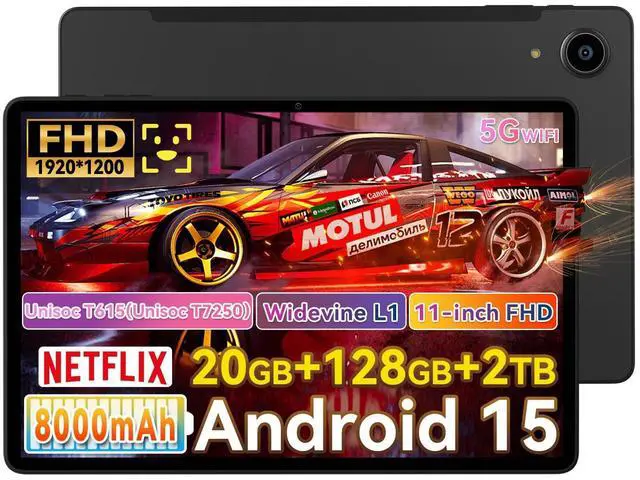 Android 15 Tablet with Octa-Core CPUPowered by the advanced Unisoc T615 CPU, this android tablet delivers 30% faster speeds than older T606 models. It runs on the latest Android 15 operating system, providing significant upgrades in multitasking capabilities, customization options, security features, and privacy protection ^^ Eye-Care FHD 11 inch TabletEnjoy crystal-clear visuals on a vibrant 1920x1200 FHD display. With Widevine L1 certification, it supports 1080P HD video playback on platforms like Netflix, Incorporating Incell technology, the screen appears clearer and more vibrant. Furthermore, it effectively filters blue light to safeguard your eyes.