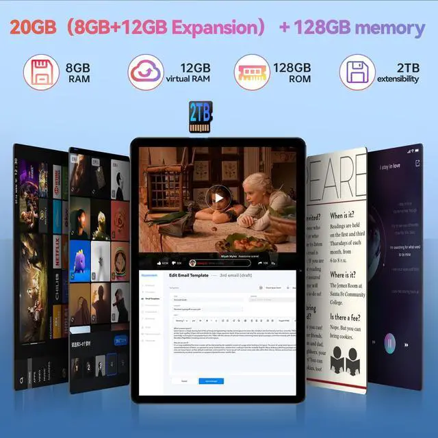 Ideal for electronics tablets focused on immersive entertainment and low-eye-strain viewing. ^^ Ample Storage CapacityFeaturing 20GB RAM (8GB + 12GB expandable) and 128GB ROM. With plenty of storage space, you can easily store all your documents, photos, videos and apps while keeping your system running smoothly. It also supports expandable to 2TB, allowing you customise your storage needs to suit your studies, work or preferences, no limits. Plus, our tablet boasts GMS certification, meaning you can easily download any Google software seamlessly, such as Netflix, Facebook, and more ^^ Long-lasting battery lifeThis gaming tablet features a large 8000mAh battery, which effectively reduces battery anxiety.