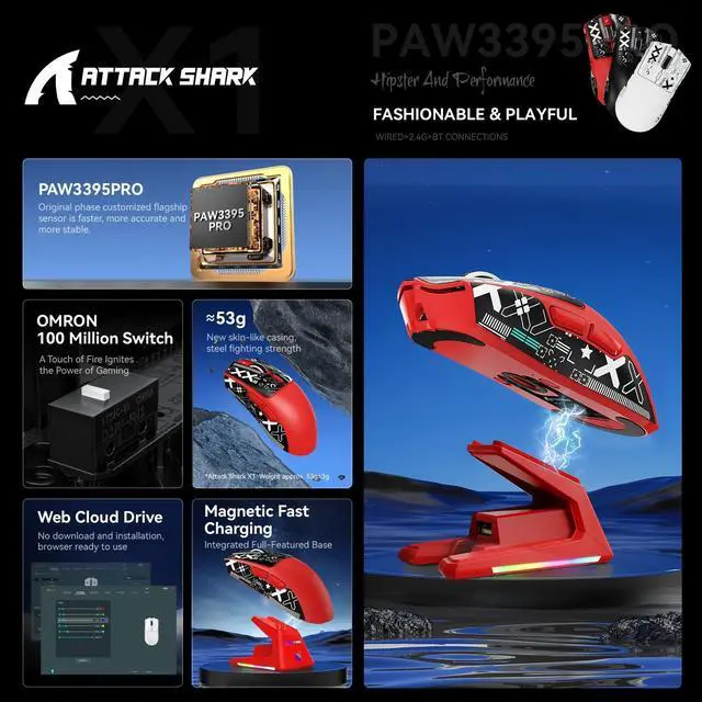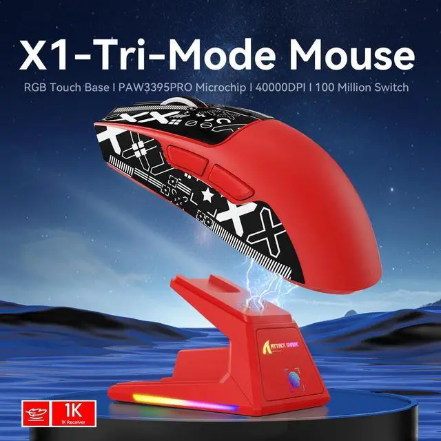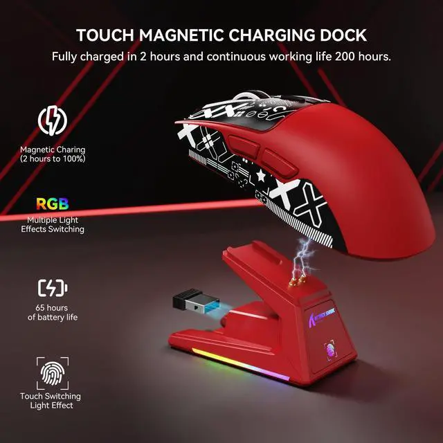 Touchpad Charging Dock Experience effortless charging with our innovative magnetic docking system. Simply snap the X1 gaming mouse onto the dock for instant power-up - no cables or alignment required. The integrated touch-sensitive panel lets you customize RGB lighting effects with a fingertip tap, adding personalized flair to your gaming setup while keeping your mouse 100% battle-ready. ^^ 3395PRO Gaming SensorDominate every frame with tournament-grade precision. Our 3395PRO sensor delivers pixel-perfect tracking up to 40, 000 DPI and 650 IPS, with 6 programmable sensitivity presets. Engineered for zero smoothing/acceleration, this pro-level sensor ensures micro-movements translate instantly - whether you're headshotting in FPS games or executing spreadsheet macros.