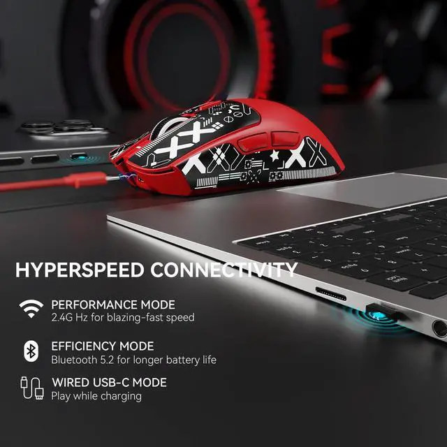 ^^ Tri-ModeTo meet the needs of different scenarios, the X1 wireless mouse supports three different connection modes: wired USB-C mode (1000Hz polling rate), ultra-stable 2.4GH z wireless via nano receiver (1ms response), and Bluetooth mode (3 devices memory). Simply press the button on the back of the mouse to easily switch modes to meet your diverse needs! ^^ 53g Ultra-Light Redefine agility with aerospace-grade construction. Our liquid nitrogen injection molding creates a featherlight 53g frame (30% lighter than standard mice) without compromising durability. The ambidextrous honeycomb shell ensures maximum airflow during marathon sessions, while textured side grips deliver surgical control during flick shots. ^^ 100 Million ClicksBuilt to outlast your gaming career. Our gold-plated mechanical switches undergo MIL-STD lab testing to guarantee 100 million click cycles - 8x industry standard. The optimized 60g actuation force provides crisp tactile feedback with reduced finger fatigue. ^^ Web Cloud DriverCustomized X1 gaming mouse, born for e-sports. Equipped with innovative and intelligent cloud-driven webpage, bid farewell to traditional driver software, no need to download and install. The open-source driver automatically identifies your computer system, and allows for DPI adjustment, rate of return, competitive mode, customized buttons, macro recording, personalized key mapping and other advanced functions.