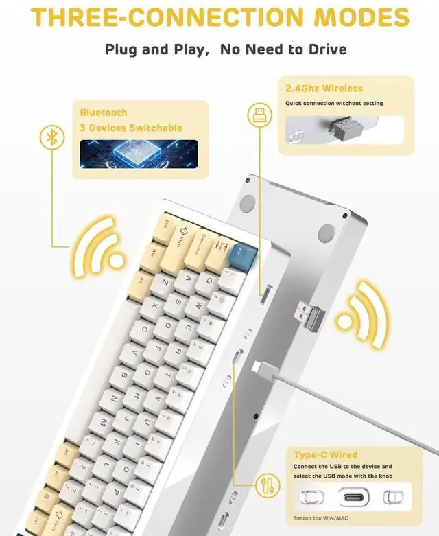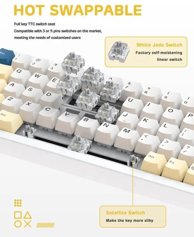 • [Hot Swap Linear Switch]This M71 Mini compact Tri-Mode mechanical PC gaming keyboard is hot swappable,Anti-Ghosting and PCB board supports 3/5-pin switches,allowing to customize keycaps&switches like AKKO,EPOMAKER,Glorious,Geteron,Kailh,Cherry,RK...The Pre-lubed Linear White Switch responds quickly,silent and ultra-light keystroke feeling,high performance,soft and flexible for gamers,typist&video makers...The appearance of 3 colors is perfecr for gaming, more fun for home and office.