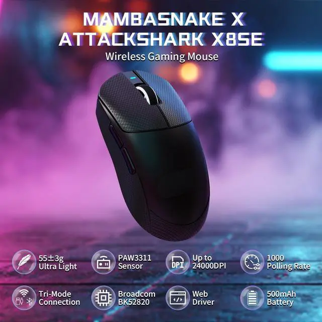 Tri-Mode Pro Connectivity & Long-Lasting BatteryEnjoy versatile connectivity with wired (USB-C), 2.4GH z wireless, and Bluetooth modesseamlessly switch between devices using the bottom button. The 2.4G mode delivers esports-level responsiveness with a 1000Hz polling rate, while the built-in 500mAh battery offers up to 65 hours of uninterrupted use, perfect for gaming, work, or study. ^^ Esports-Grade Sensor & Precision ControlEquipped with the flagship PixArt PAW3311 sensor and Broadcom MCU, this mouse delivers pixel-perfect tracking, up to 25, 000 DPI, 400 IPS, and 40G acceleration. With 6 adjustable DPI levels and 50 precision tilt control, experience zero-lag performance ideal for FPS and MOBA games.