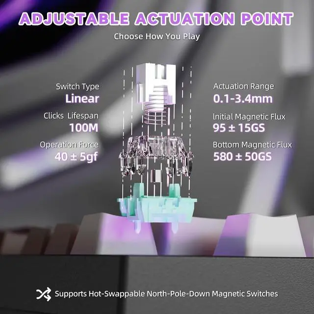 Adjustable Actuation: The R82 HE keyboard boasts aluminum alloy plate, 5 layer filling and custom magnetic switch to ensure unwavering stability during intense sessions, transforming every tap into a HIFI-soundstage experience, and providing lightning-fast, personalized response, the 0.005 mm ultra-precision RT system enables instant stopping and rapid-fire combos. Experience jiggle-peek mastery and quick-scope shots with zero deadzone interference ^^ Ergonomic 16.8
