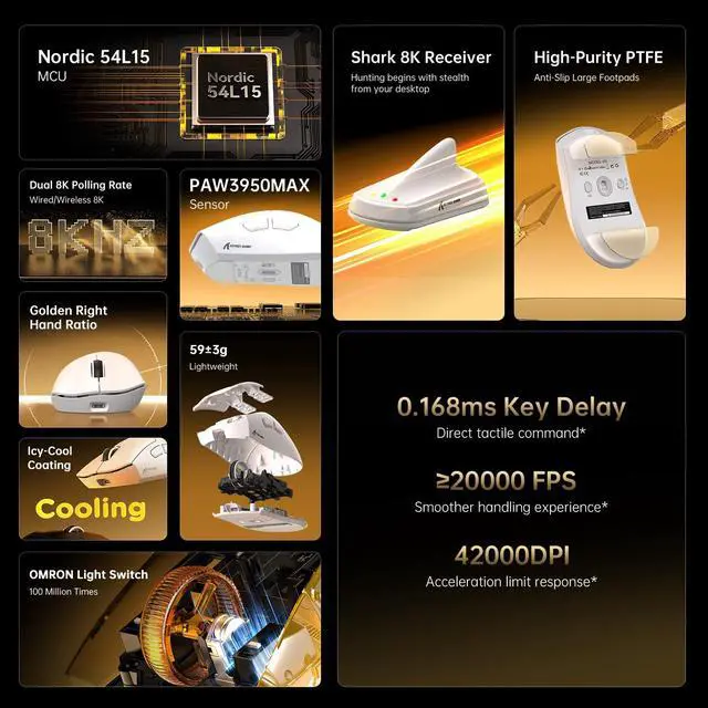 PixArt PAW3950MAX Gaming SensorUp to 10 times more energy efficiency than other gaming mice, with 700 IPS accuracy, 65G acceleration, offering adjustable DPI from 50 to 42,000 sensitivity for more granular aim and control.