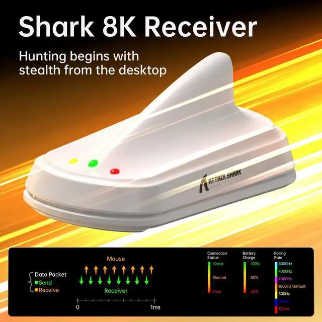 8K Polling RateBoth wireless and wired modes support polling rates up to 8KHz, achieving low latency, low power consumption, faster data transmission speeds, and stronger anti-interference capabilities.