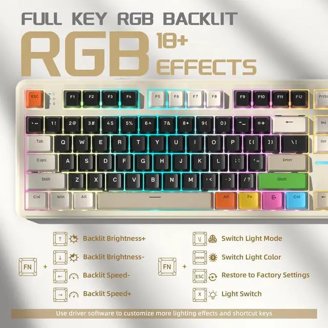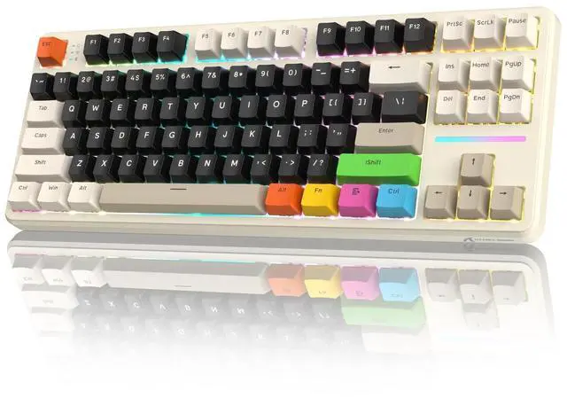 Triple Connection Modes The X87 keyboard supports three connection methods: Bluetooth, 2.4G wireless and wired. It can be easily switched through the side keys and has strong compatibility. Whether at home, in the office or traveling, you can always enjoy a smooth typing experience. The keyboard is suitable for PC, laptops, tablets, mobile phones, PS, etc., meeting all the needs of users. ^^ Hot-swappable & Customized SwitchThe hot-swappable mechanical keyboard is equipped with ATTACK SHARK customized pre-lubricated linear strawberry switch, which supports 3-pin or 5-pin switch replacement. The full-key hot-swappable design allows you to replace the customized axis at will to meet different typing feels and needs. Whether you need a lighter click feeling or more powerful feedback, X87 can meet your needs. ^^ Gasket Structure & PCB Single Key Slotting The wireless mechanical keyboard adopts an advanced leaf spring Gasket structure, combined with five layers of filling materials (including PORON sandwich cotton, IXPE shaft pad, PET voice pad, shaft seat silencer foam and bottom foam), which better optimizes elasticity and stability, effectively reduces keyboard noise, and improves typing comfort. ^^ Programmable RGB BacklightsThis gaming keyboard has 18 colorful RGB lighting effects, adding a great atmosphere to the game.