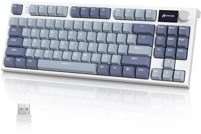 Smart TFT Color Display & Knob Design86 gaming keyboard built-in smart TFT color display can intuitively display the keyboard status, including custom GIF image, connection mode, WIN/MAC, battery level, date and time. The CNC metal knob can quickly adjust the connection mode, backlight effect/color/brightness speed, volume and language, etc. Undoubtfully, the mini displayer will bring the customizability of the keyboard to the next level. ^^ Tri-mode Connection & Large Capacity BatteryUnlike wired keyboard, K86 built-in 4000mAh battery, features triple modes-Bluetooth, 2.4G Hz and USB-C connectivity - for versatile and convenient use.