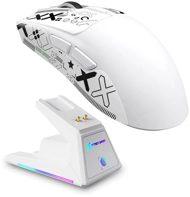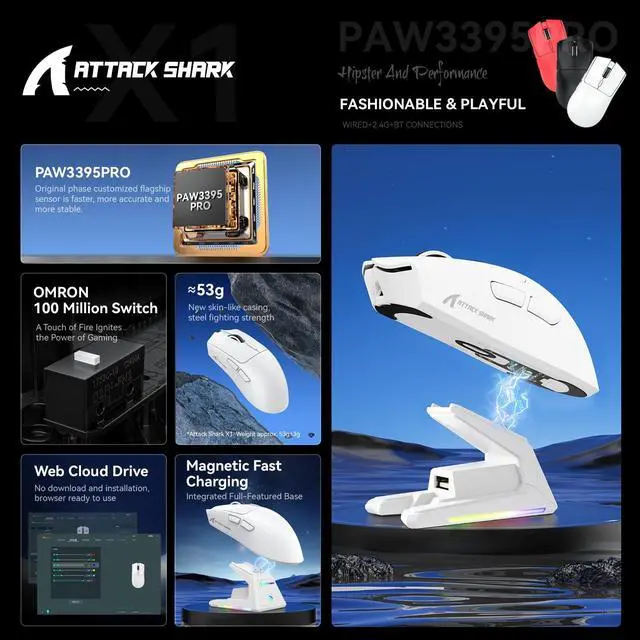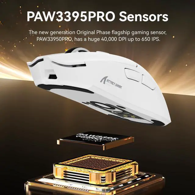 Touchpad Charging Dock Experience effortless charging with our innovative magnetic docking system. Simply snap the X1 gaming mouse onto the dock for instant power-up - no cables or alignment required. The integrated touch-sensitive panel lets you customize RGB lighting effects with a fingertip tap, adding personalized flair to your gaming setup while keeping your mouse 100% battle-ready. ^^ 3395PRO Gaming SensorDominate every frame with tournament-grade precision. Our 3395PRO sensor delivers pixel-perfect tracking up to 40, 000 DPI and 650 IPS, with 6 programmable sensitivity presets. Engineered for zero smoothing/acceleration, this pro-level sensor ensures micro-movements translate instantly - whether you're headshotting in FPS games or executing spreadsheet macros.